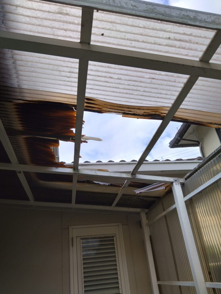 波板の破損が大きく、全面張替えさせて頂きました。作業時間は約半日でした。波板は劣化が進むと破損しやすくなり強い風などで波板が飛んだり割れたりする為その前に交換をお奨めします。波板の張り替えは、適切な時期に行い、素材の選定や施工方法に注意することで、長持ちさせることができます。